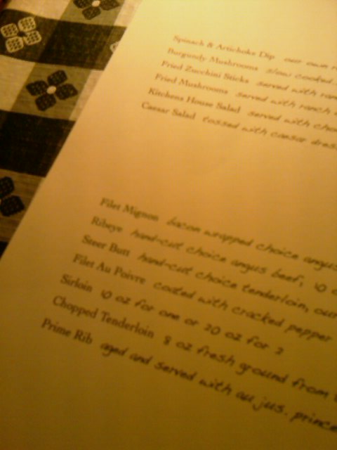 Lousy picture I know (cell phone in dim light), but check out the 3rd menu listing under “Filet Mignon” and “Ribeye”. See I told you: “Steer Butt” is an actual menu selection.