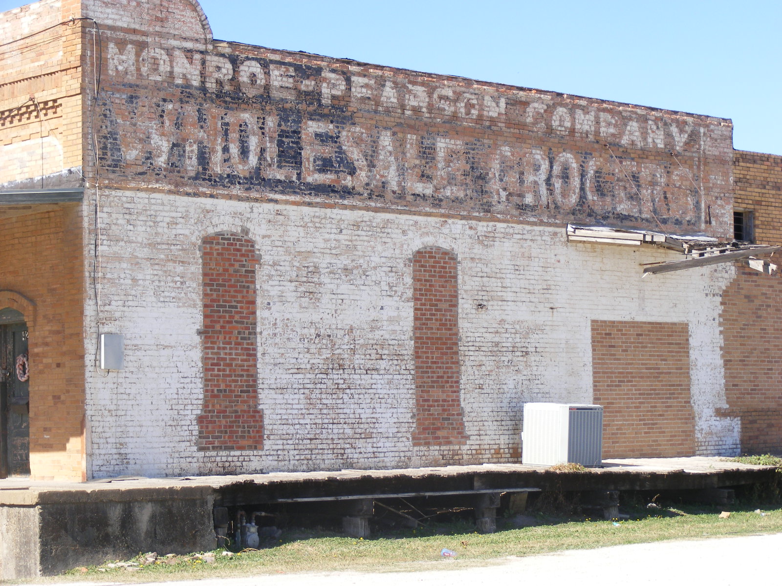 Weathered Sign, bricked-in windows, wood deck and canopy with modern AC unit