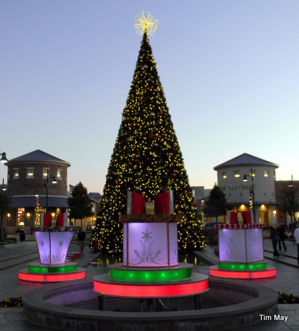 But wait…I came upon this at a nearby shopping center a couple weeks ago. I actually spent several minutes talking to the guys programming the music and lights. I told them not to worry that my photo software could easily take the lean out of the tree…you should have seen them give this tree a look-see from all angles. HoHoHo….