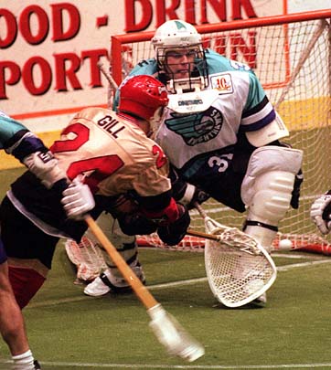 In the U.S., a professional indoor lacrosse league formed in the late 80’s to play “Box” or “Boxla” (so as not to be confused with outdoor lacrosse – the real version of the sport) called the National Lacrosse League. It has 10 teams currently playing a wicked version of bastardized badminton. Oh yeah, here’s some more!