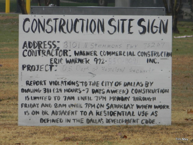 Budget update: local and federal dollars are proudly being saved as displayed when a City of Dallas required construction sign for a U.S. Dept. of Homeland Security project is posted using a thrifty, hand-lettered, painted-over, recycled sign done by the construction company’s 7 year old son (from the way it looks).