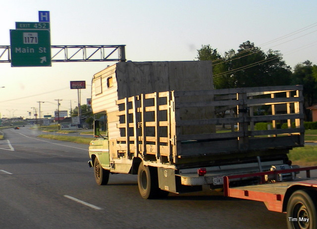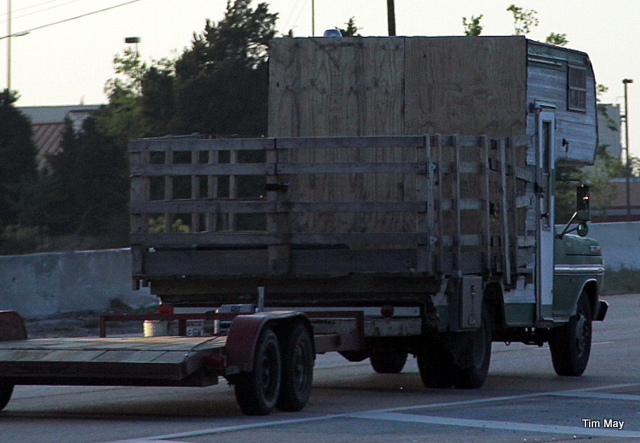Don’t you know I excited the highway and waited on the service road for him to pass…twice. His top speed was 40. Any faster and the plywood would have set sail, and the rail nails popped out.