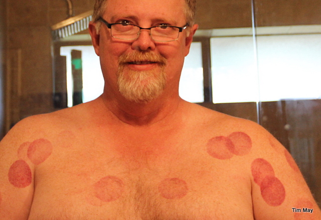 I’m going back next week for another round of Qidong and cupping. I feel great and what Tony does to my body appearance can’t make me look any worse than I already do. This guy knows what he’s doing! I’m still a little perplexed about all this from-the-waist-up-work for just a sore (no longer) elbow.