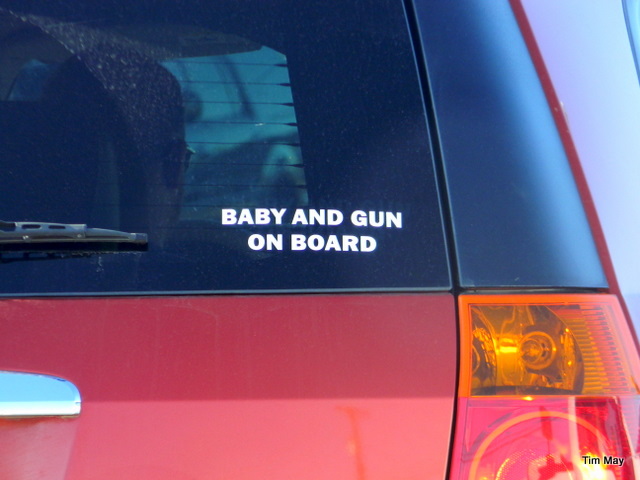 Egads! Car thieves be forewarned: occupants are ‘Locked and Loaded’ (and we’re not just talking about a diaper change going on in this car)!