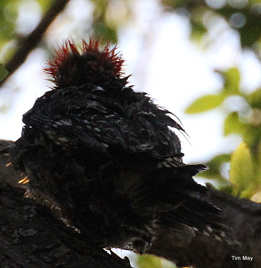 “Woody” seemed not to mind my watching. He danced up and down the trunk, starting at the base of the tree and hopping up the trunk to the lowest branch. There, Woody would perch, out of the reach of the sprinkler. He would shake off the water, act like he was catching his breath, and then glance down to the ground with what I swear was a grin on his beak. He would then leap off the perch, glide to the base of the tree…just so he could start the upward journey-hop all over again. Quite funny actually. Woody repeated these antics about 10 times.