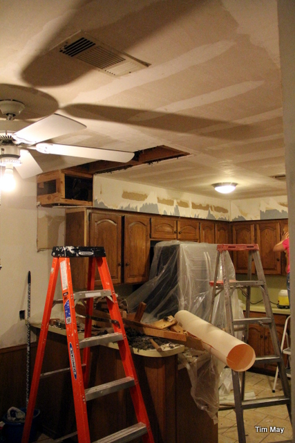 Only 3 weeks out of debt for having remodelled the master bedroom and bath, and now look what we’ve done. Cabinet missing, fur-down gone, wallpaper striped, popcorn off the ceiling, holes overhead still in need of patching, insulation everywhere, the smell of (sheet rock) joint compound in the air, ladders poised for service, and a hammer – you gotta have a hammer – on the counter.