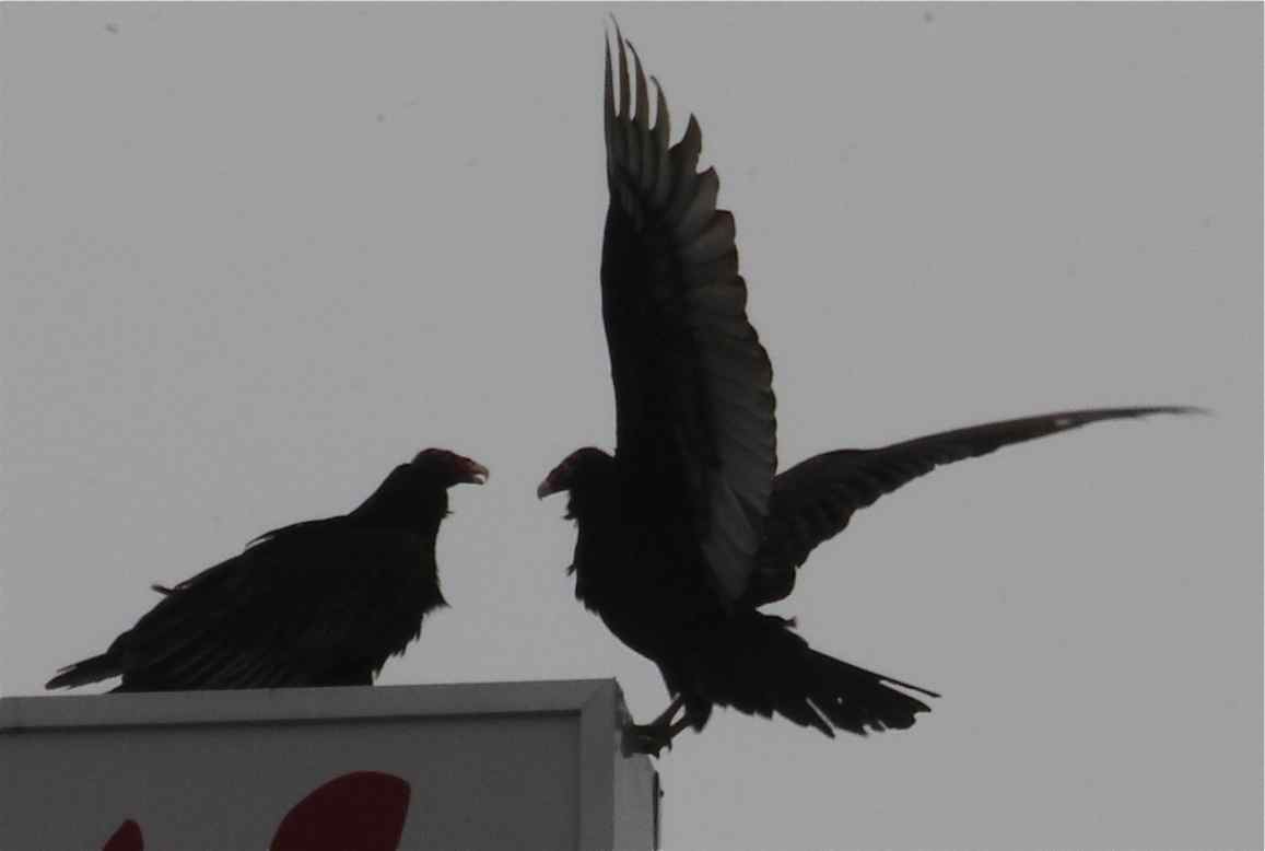 Interestingly, outside this Japanese Steakhouse two buzzards were not happy with not having anything to eat either. So instead, they commenced to fighting over their perch (the restaurant sign), that just so happened to be above the back door of the restaurant....hmmmm