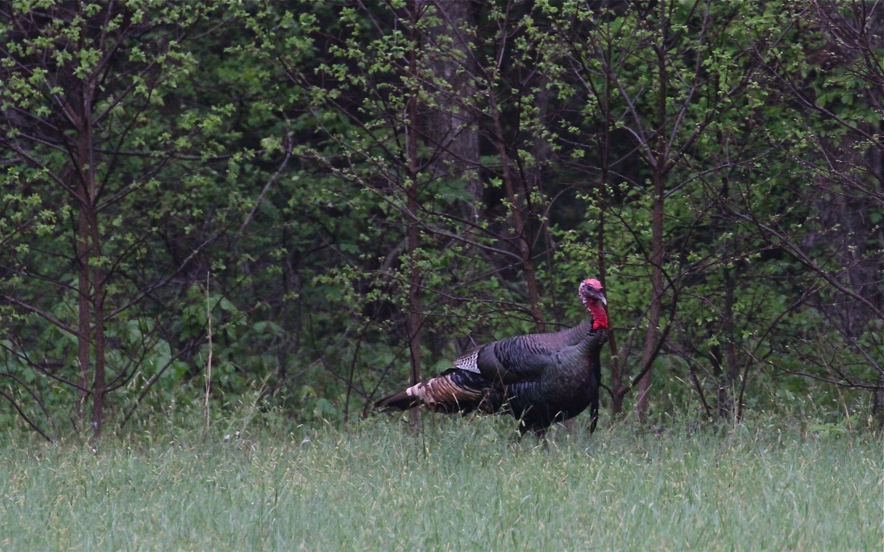It's what I call a "mush" sunrise...low clouds, haze, fog, and probably ozone make for all the morning colors kind of mush together. Some days you have to really work at seeing (and appreciating) the beauty in what's given. I like "mushy" sunrises.This Jake has been out gobbling solo the past couple of mornings. That's a pretty sure bet (the) Tom isn't ready to give up his rule around these woods just yet. So I'm guessing young Jake's life is kind of "mushy" right now. Yet he still manages to offer up a colorful pose along the cool-looking tree line.