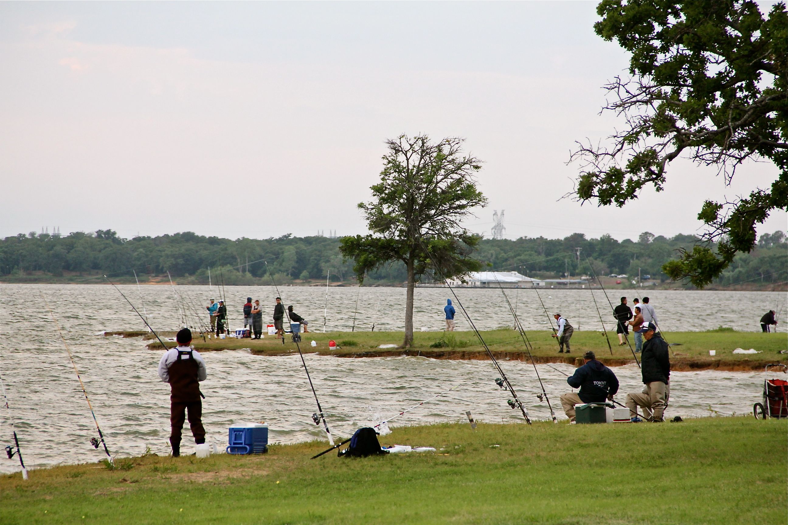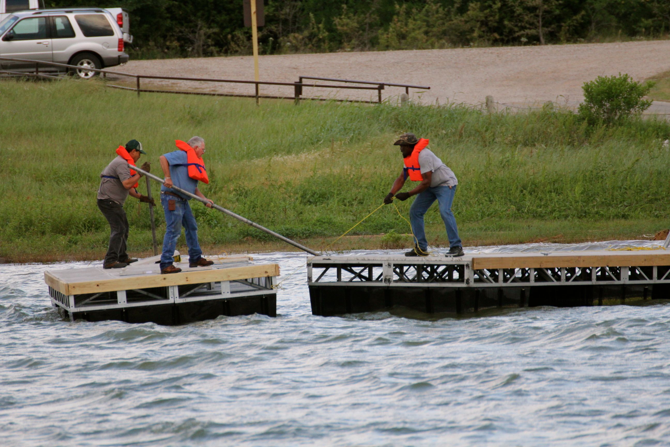 These guys were adding a "spot" to the boat dock this morning...in a 20mph wind and choppy waters. It was quite an exercise, in more ways than one. Sure I holstered my camera and helped them. :)I don't think there was one empty "spot" left along the shoreline this morning. I've got to think with so many poles in the water the fishing really isn't that good...but maybe it is just the right "spot" for a Wednesday morning social event.The local ABC news helicopter found a "spot" to hover for 10 minutes...right over our office building this afternoon. (still don't know why...)