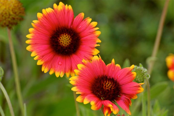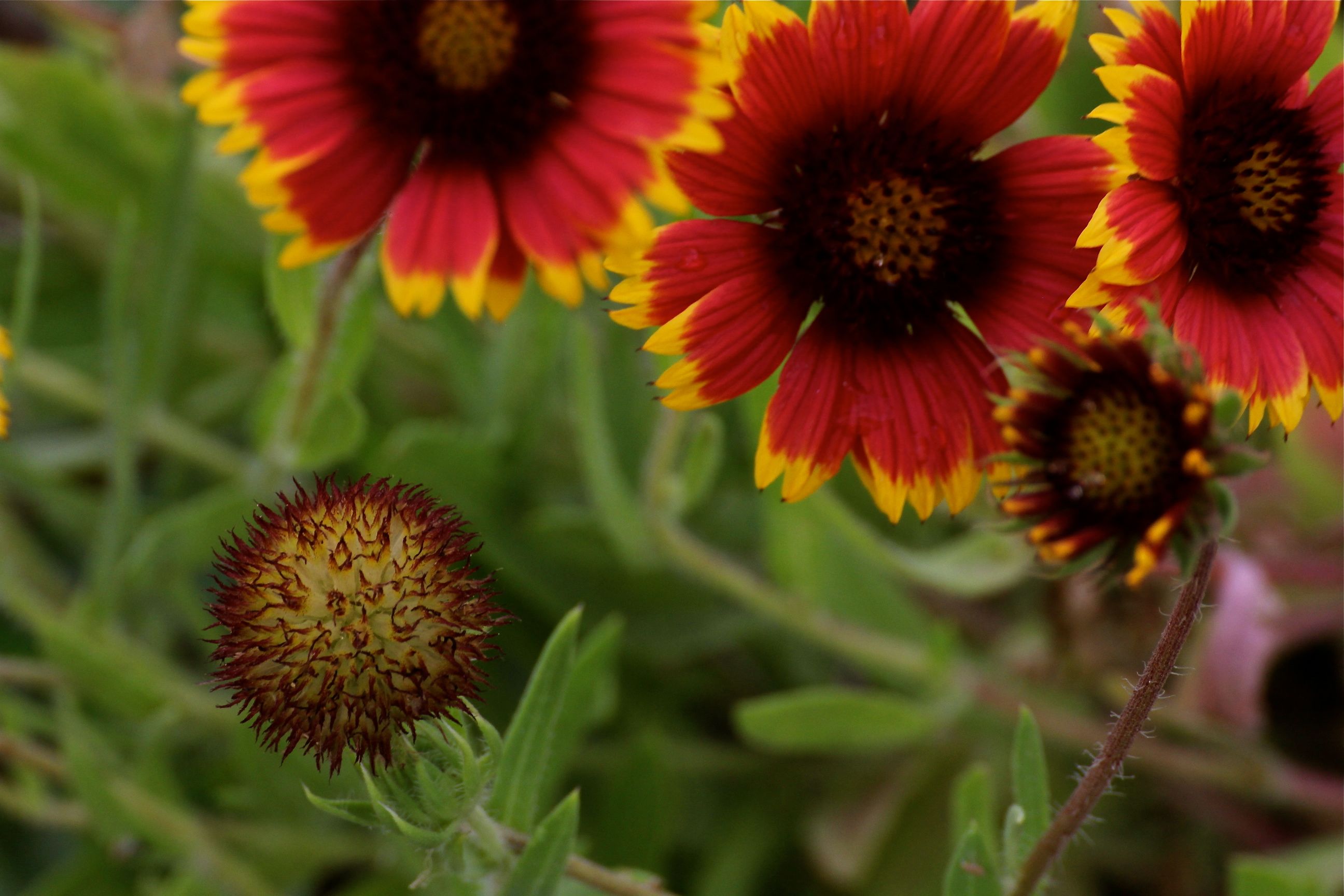 Mexican Hat shedding a few tears, giving perch to a spectatorthe colorful, can't-go-wrong-with-this-one Indian Blanketa grove of Plains Coreopsis (a grove?)Texas Dandelion...not a typical dandelion by any meansThis picture I like...a very peach-fuzzy, young Black-eyed Susan Back to that Indian Blanket. All these pics taken in front of Wylie (Texas) City Hall this morning.