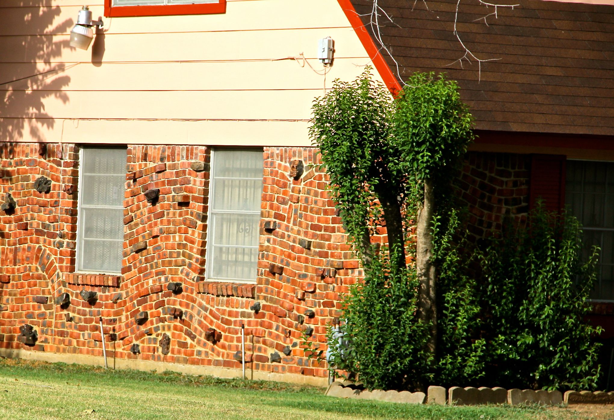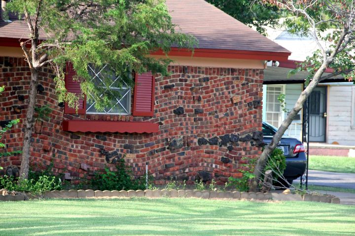 First to catch my attention was the industrial-sized porch light on this house, then the oddly maintained shrubbery, oh but wait…what’s up with those bricks?The mason was either an artist, a drunk, or maybe so frugal he made do with what he had on hand…but the results are cool none the less. (Wonder what made them think the flower box needed to be hung square)