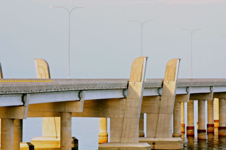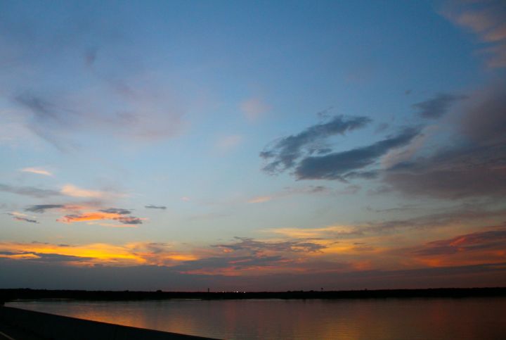 What I thought was going to be a blah sunset, turned out kind of nice. Catching the sunset reflection across the water while driving the sailboat-overpass crest of the toll bridge was…well…let’s just say it was sheer luck and leave it at that for now….New bridge work continues (and it’s taking for-e-ver)….Hitting the (toll) road in search of a sunset picture…Hey! what happened to the background? (it was raining just a few hundred yards away).