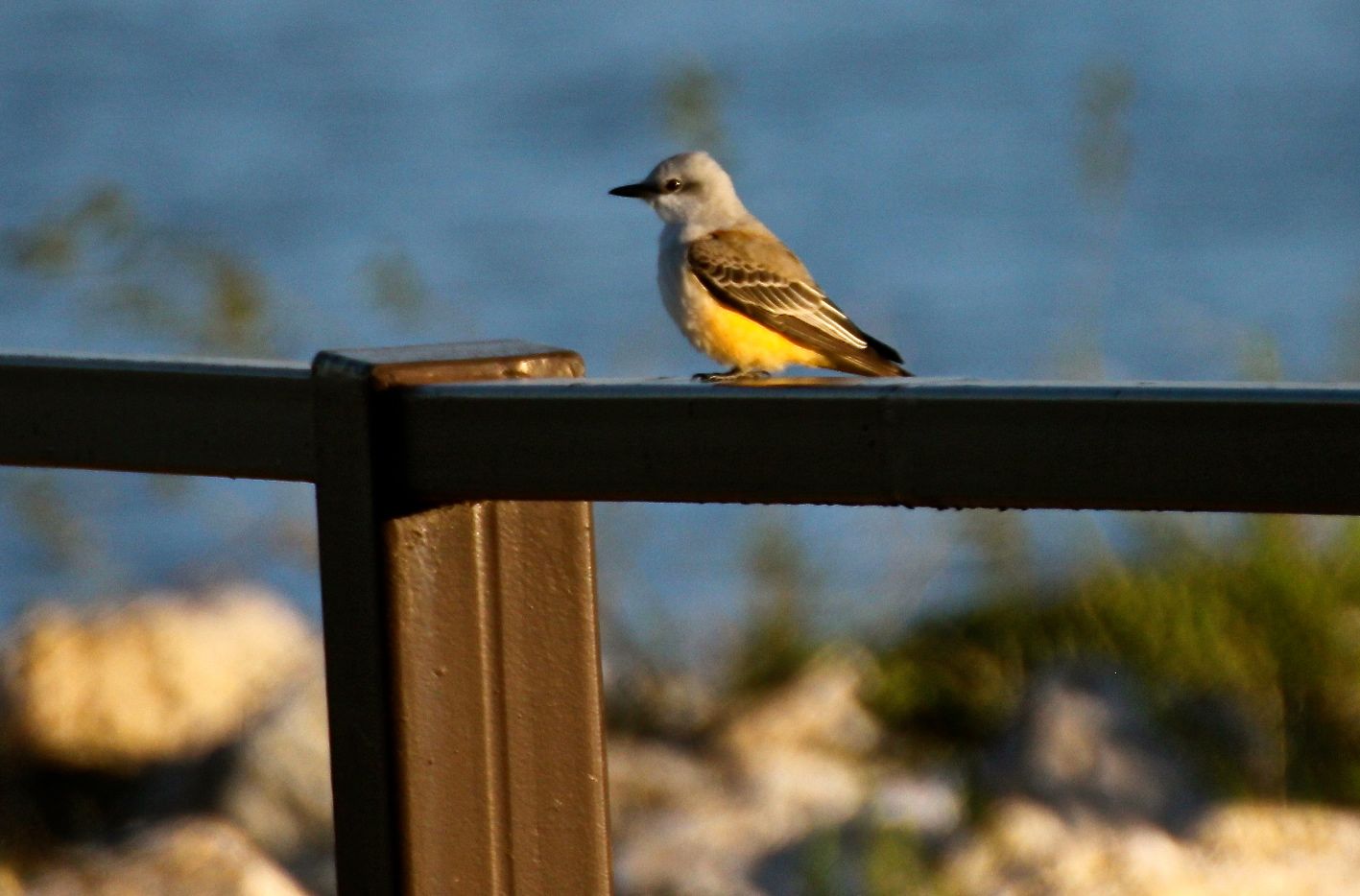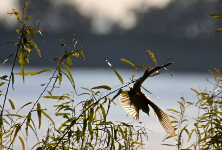 He bops around from perch to perch until he too says “enough” and takes off, leaving me pointing a lens into the bright morning sunrise