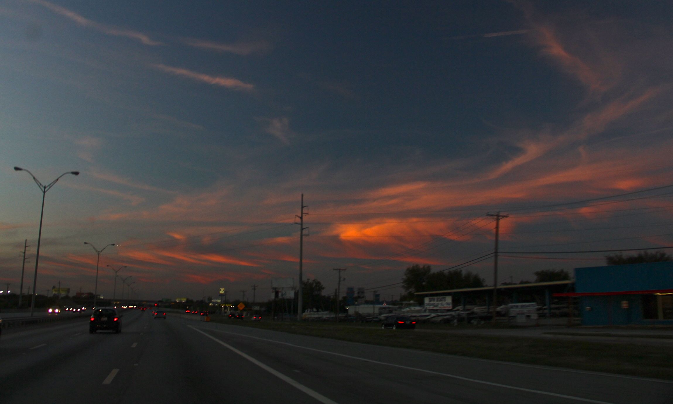 The evening and sunset highlights a few way-cool clouds (and yes, that’s me driving down the freeway taking pictures – don’t tell me insurance agent please)