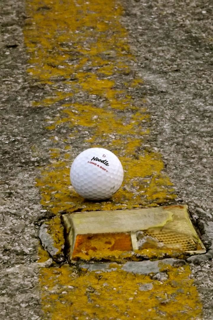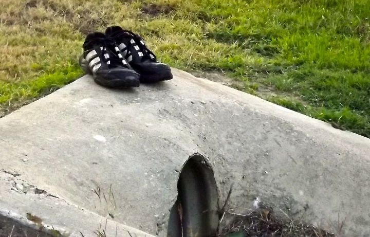Monday morning at the lake park gives discovery of several items left behind over the weekend…stuff that just ain’t natural.First the hat, then the shoes. I will admit I spent a brief moment looking for some confused half-dressed guy looking desperate for sun block and toe nail clippers…even looked in the drain pipe (didn’t find him)Oh wait a minute….maybe the mystery half-dressed guy was simply playing through, got angry when he couldn’t find his errant shot. and tossed his hat and shoes about in a fit of irritation. “Hey buddy! It’s over here laying on the yellow stripe. Ah go ahead – I’ll let you tee up this shot”