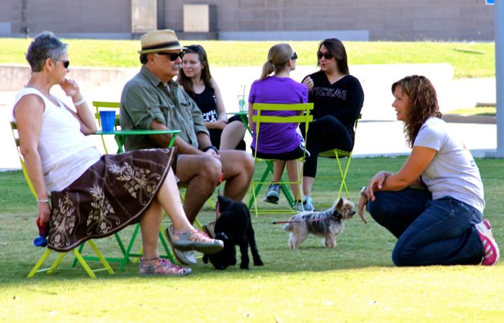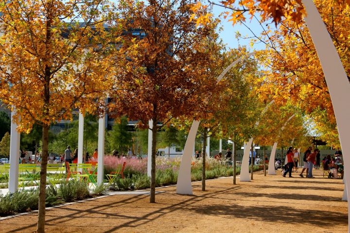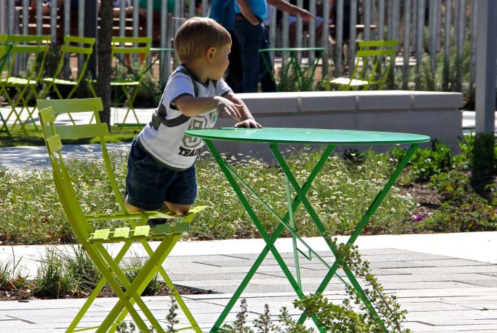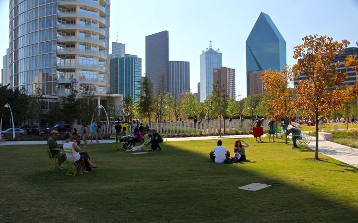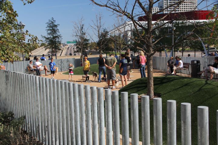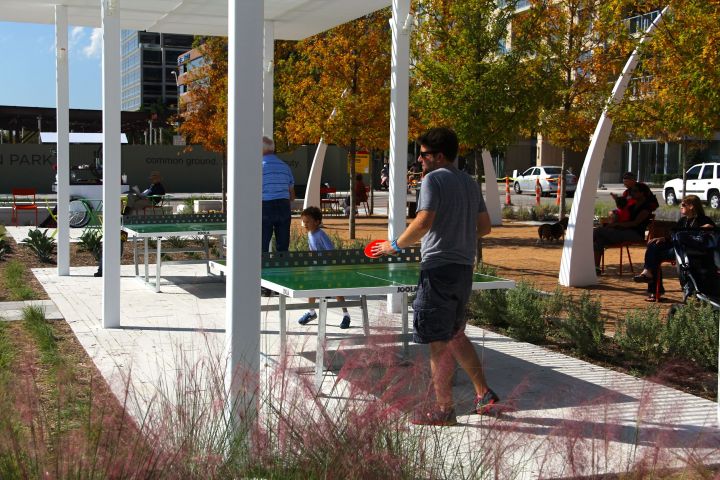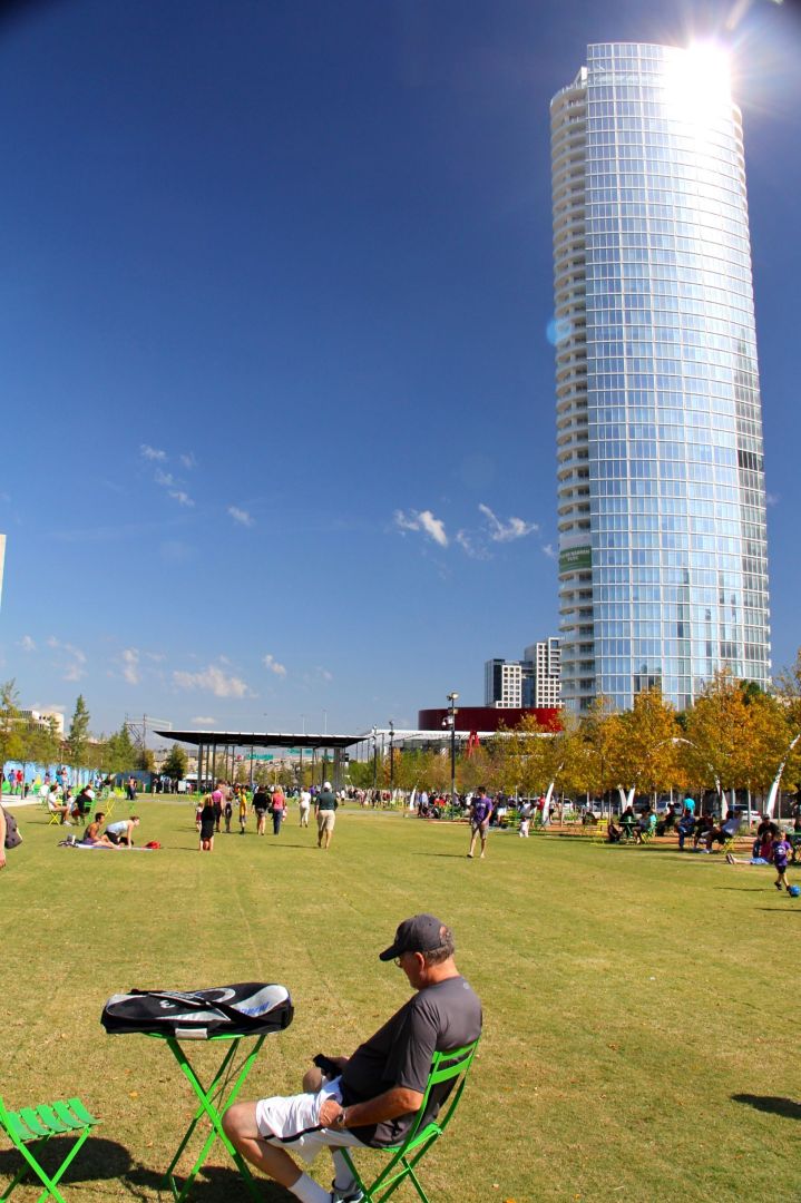 Klyde Warren Park between downtown Dallas and uptown Dallas open last weekend….An urban park destined for becoming one of Dallas’ most popular….It spans over a 6-lane freeway and is flanked by high-rise buildings (some casting quite the glare)…The dog park, although small, is very popular….Families find shade in the downtown building shadows….Ping pong can be played while at the park…Kids are everywhere – portable tables and chairs are as well….You can take in a friendly, yet competitive game of chess if you so choose….Game over!Even found a K-State family using the lawn expanse for a little exercise – Go Cats!Walkways, gateways, funways….