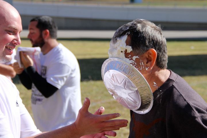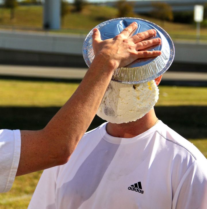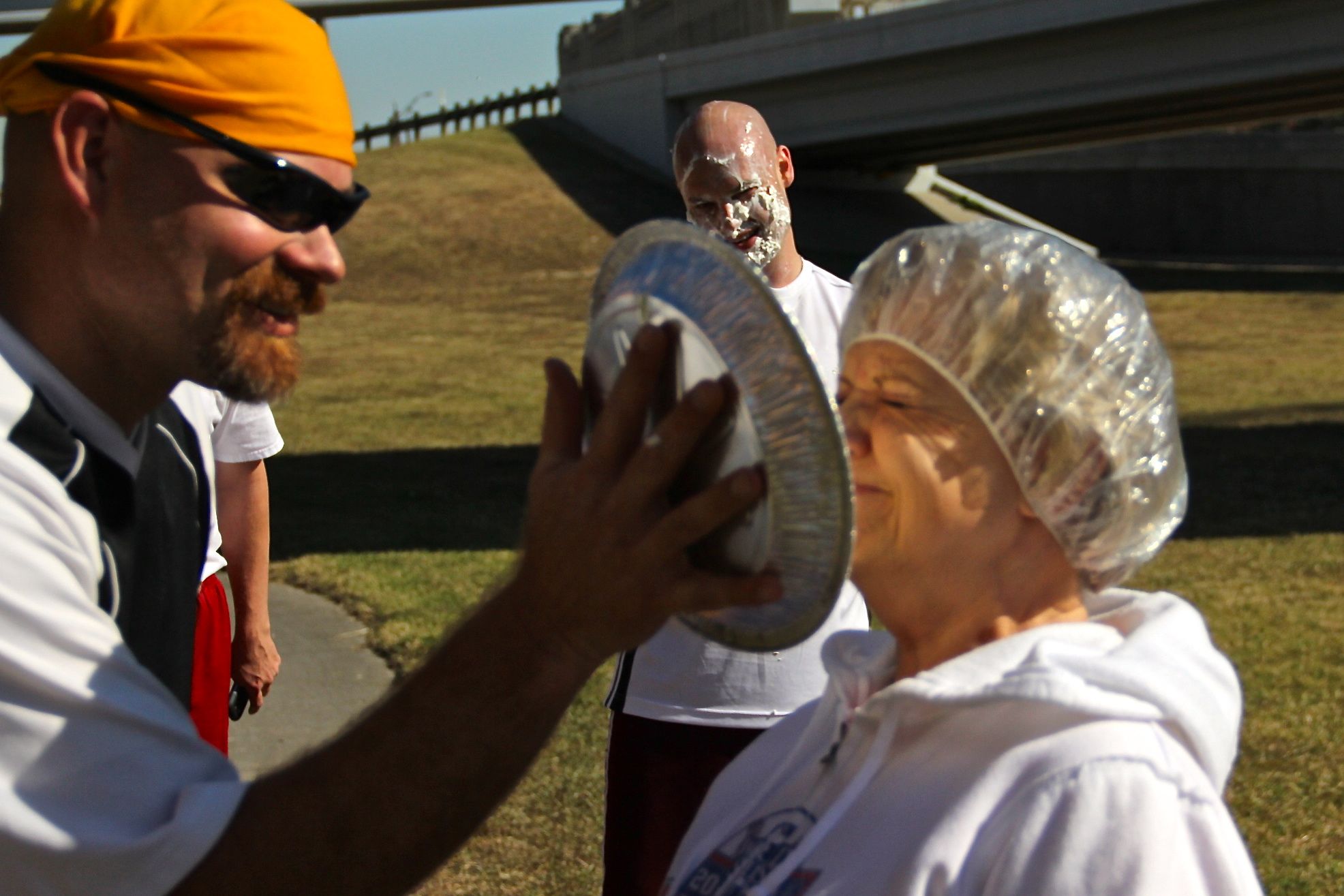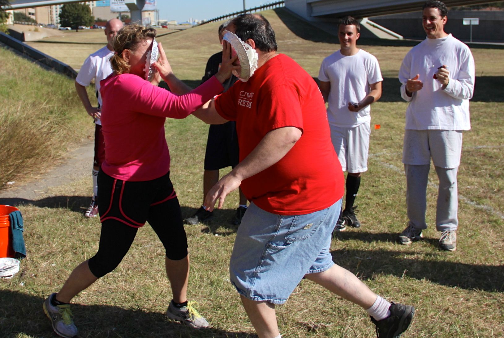 Each of the last 4 years, the Friday before Thanksgiving, my company has a rousing, lunch hour game of flag football to raise money for a worthy cause. Past games has sent money to Children’s Hospital, a soup kitchen, and Scottish Rite. Hospital. This year our money goes to the family of a co-worker that unexpectedly passed away a few weeks ago. Whipped cream pies-in-the-face always end to this day of fundraising.Ryan, this year’s event coordinator, gets a pie-beard (and foil cap)….Newlywed Andrew catches one square in the chops….For some, the pie comes to them…for others, they go to the pie.It’s maybe only once a year that a boss catches a pie to the face and grins about it….Austin was a real trooper here – he took this pie to the chops for his dad….Perhaps my favorite: a double pie smack to and from Kips and Angela….Kips wipes away the cream….Angela searches for a wash rag….