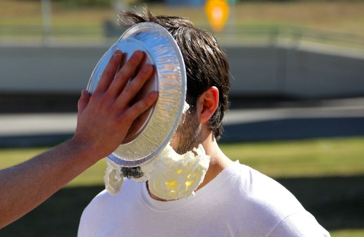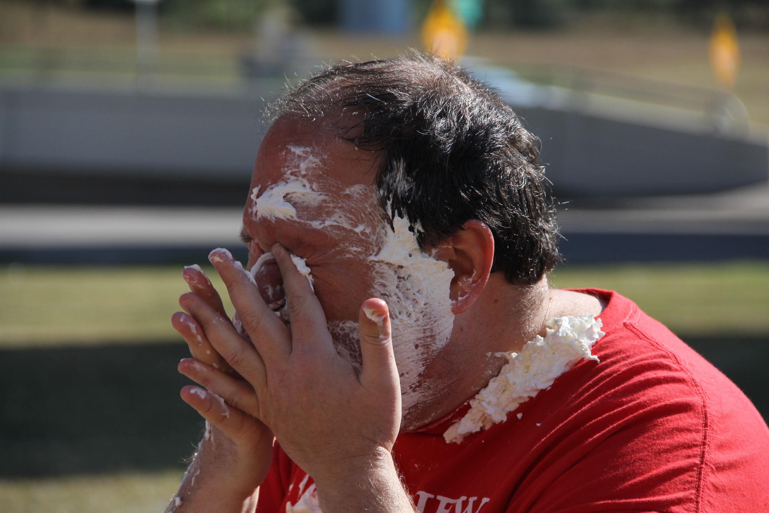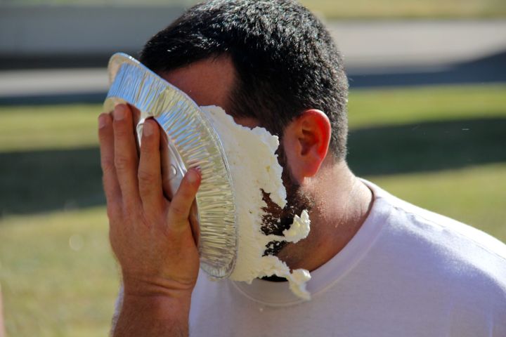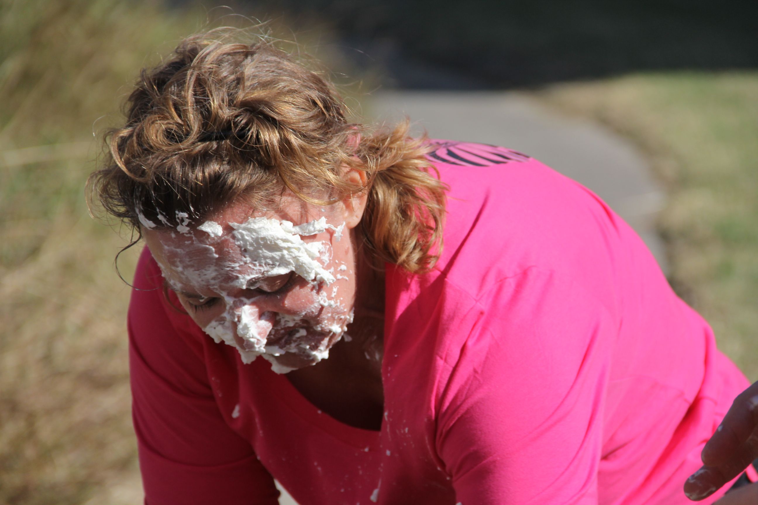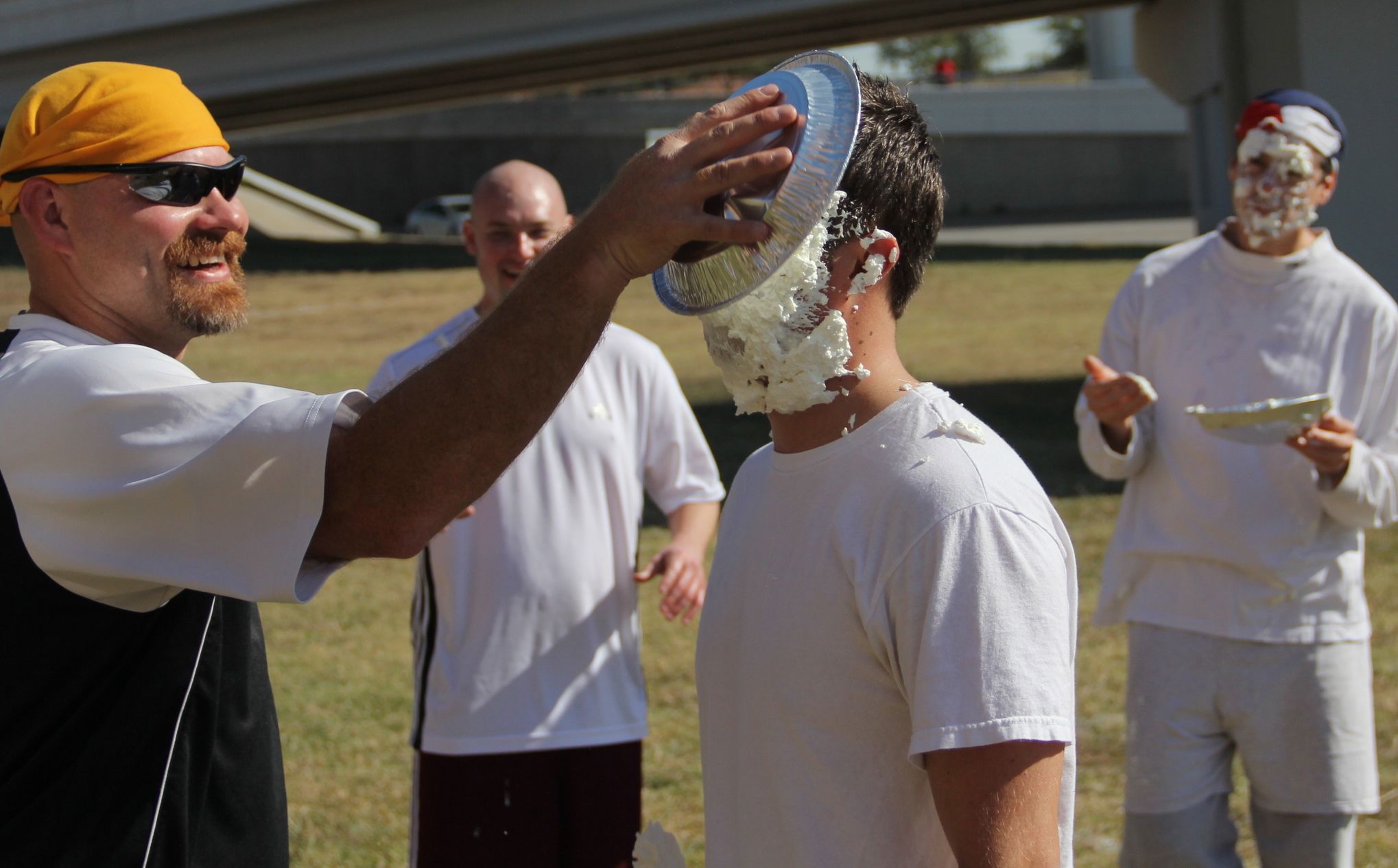 Each of the last 4 years, the Friday before Thanksgiving, my company has a rousing, lunch hour game of flag football to raise money for a worthy cause. Past games has sent money to Children’s Hospital, a soup kitchen, and Scottish Rite. Hospital. This year our money goes to the family of a co-worker that unexpectedly passed away a few weeks ago. Whipped cream pies-in-the-face always end to this day of fundraising.Ryan, this year’s event coordinator, gets a pie-beard (and foil cap)….Newlywed Andrew catches one square in the chops….For some, the pie comes to them…for others, they go to the pie.It’s maybe only once a year that a boss catches a pie to the face and grins about it….Austin was a real trooper here – he took this pie to the chops for his dad….Perhaps my favorite: a double pie smack to and from Kips and Angela….Kips wipes away the cream….Angela searches for a wash rag….