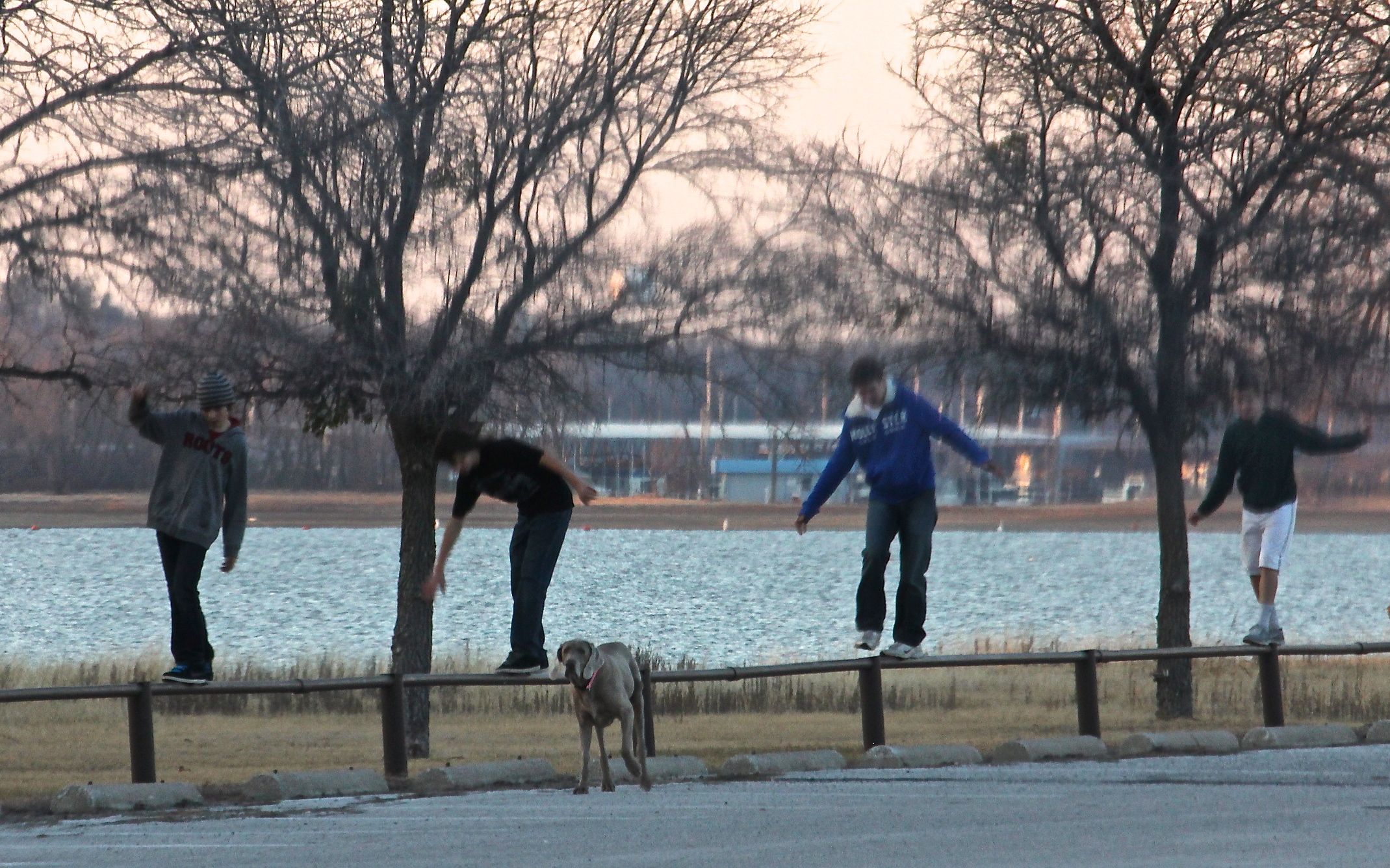 (through the truck windshield) Four boys try to walk the pipe fence while their hound dog watches me watching them….