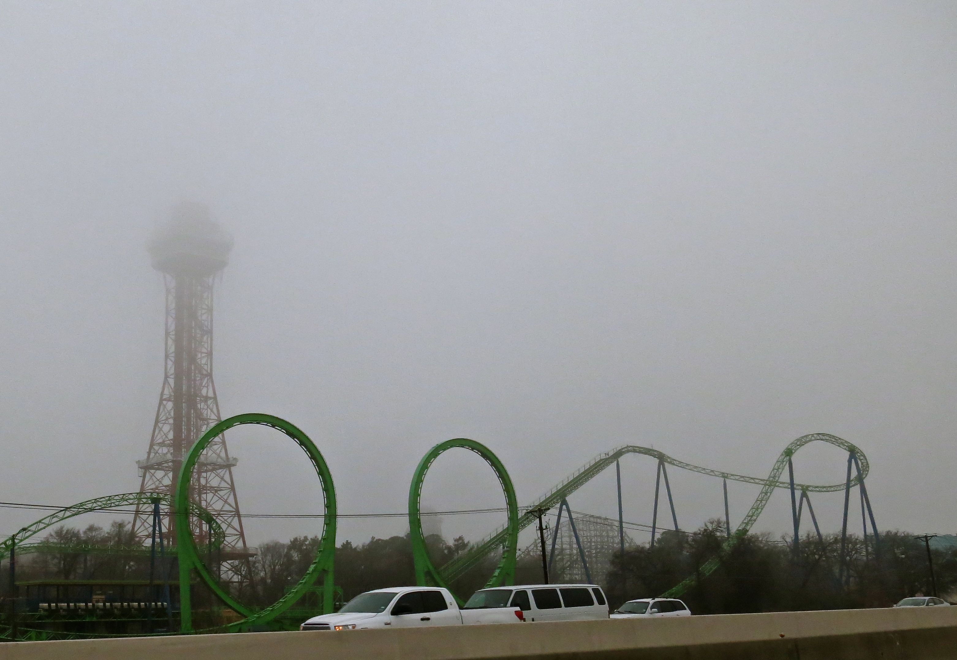 The signature Hyatt Reunion Tower (“ball on a stick”) is missing it’s top half in today’s fog…Downtown Dallas’ space ship building (what used to be called Allied Bank Tower back when I “did” the public plaza area) seems to be blasting off into the fog….The new Margaret Hunt Hill bridge (Santiago Calatrava design) over the Trinity River west of downtown Dallas is muted by today’s fog…The loop-d’-loop roller coaster and observation tower at Six Flags amusement park has parts that seemingly lead to nowhere is today’s 24 hour foggy weather…