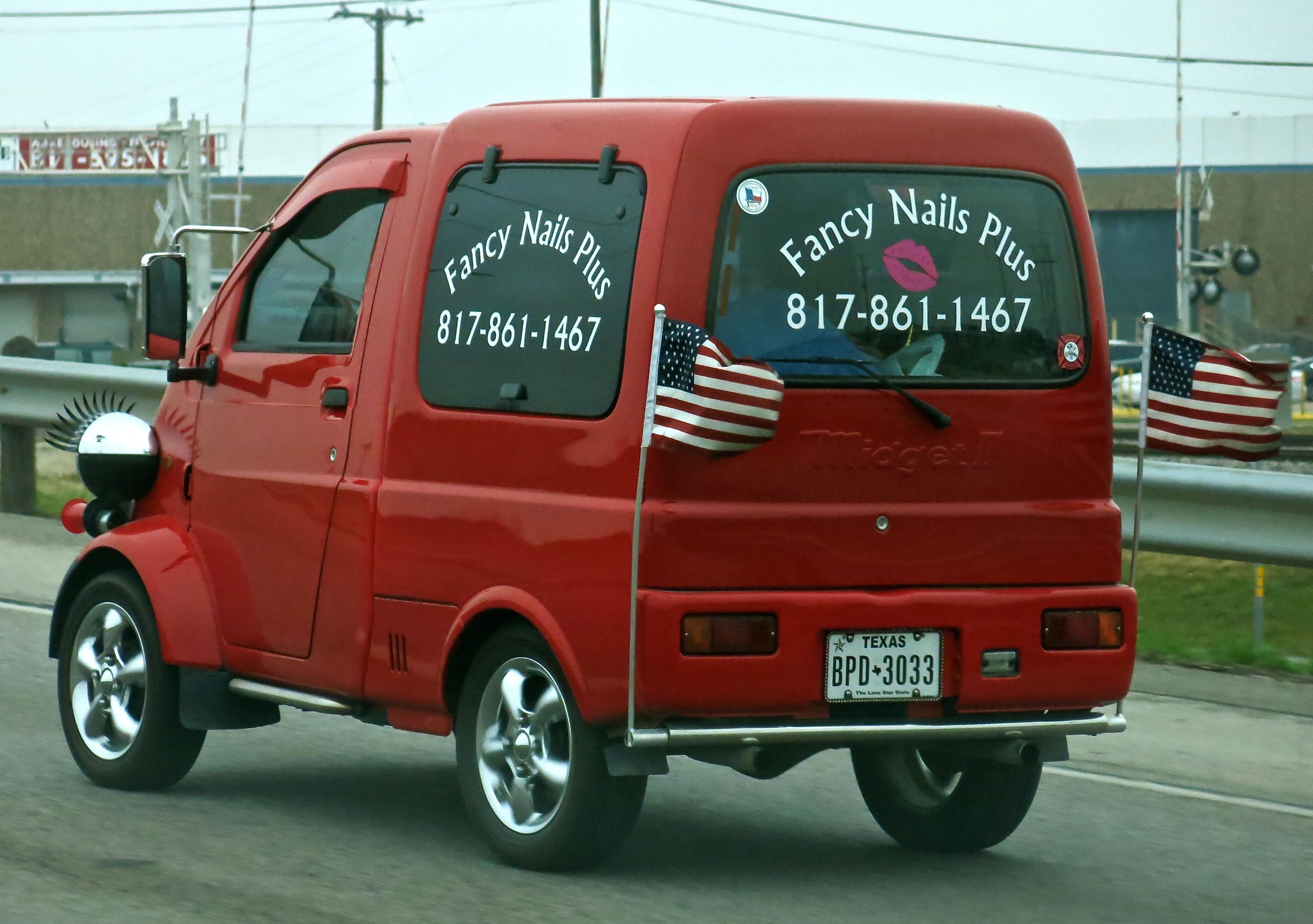 I scrambled (and struggled) with the iPhone camera app during my morning Scottie walk to capture these slow, gliding, and elegant Pelicans in flight…I scrambled (and should have struggled) with my Canon G15 camera during my evening commute to capture this absurd, are-you-peddling-that, and clumsy (Daihatsu) “Midget II” in transit (and for a nails business, what’s up with the headlight eyelashes and lipsticked lips logo?)….