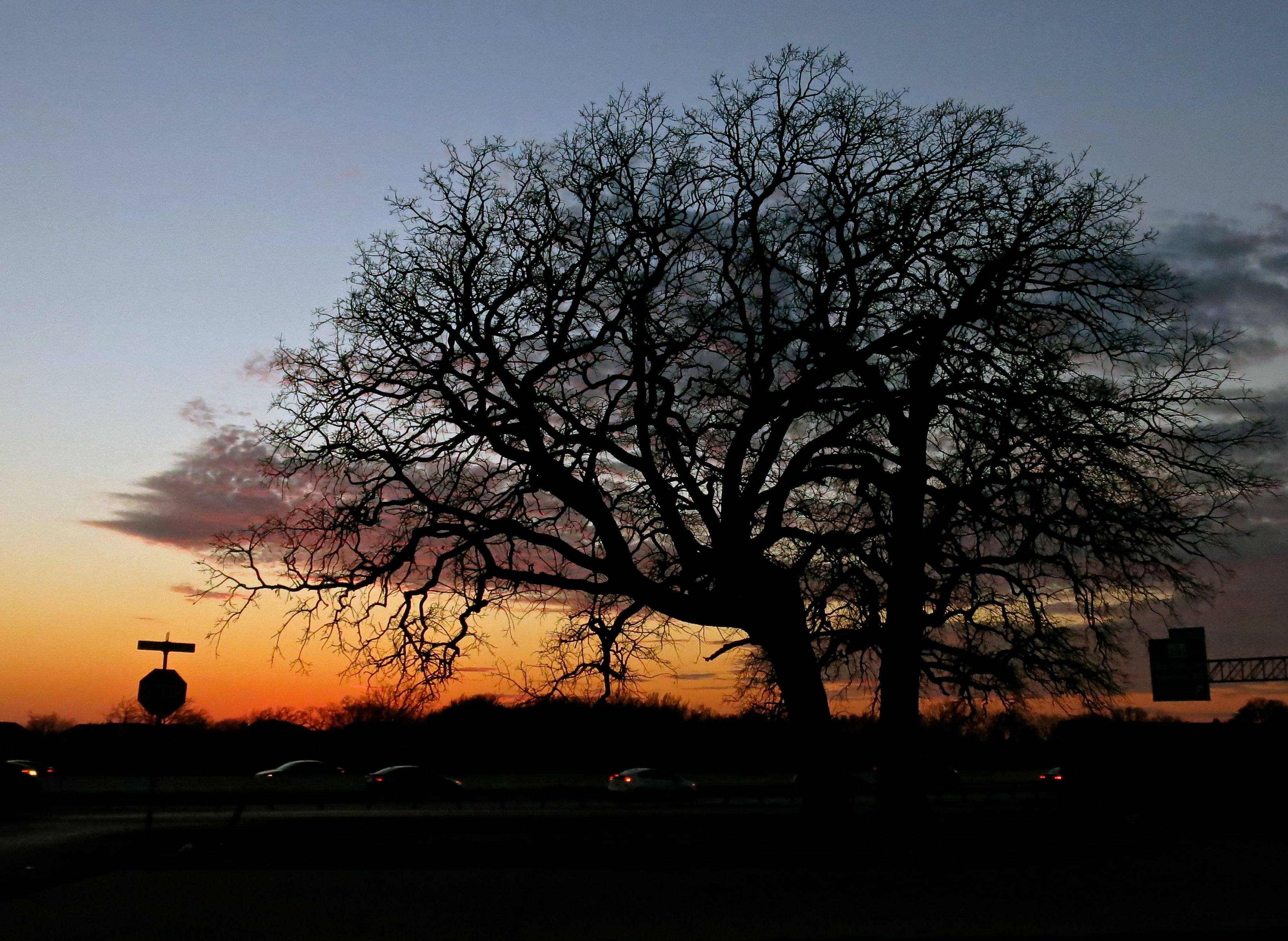 These hometown twin Post Oak trees have stood for many decades, rooted long before any one highway came along. Now I fear the number of sunsets these two will see are numbered, not by natural causes, but by the IH35E expansion (from 10 lanes to some 16 lanes). I intend to visit with them often from here on out….