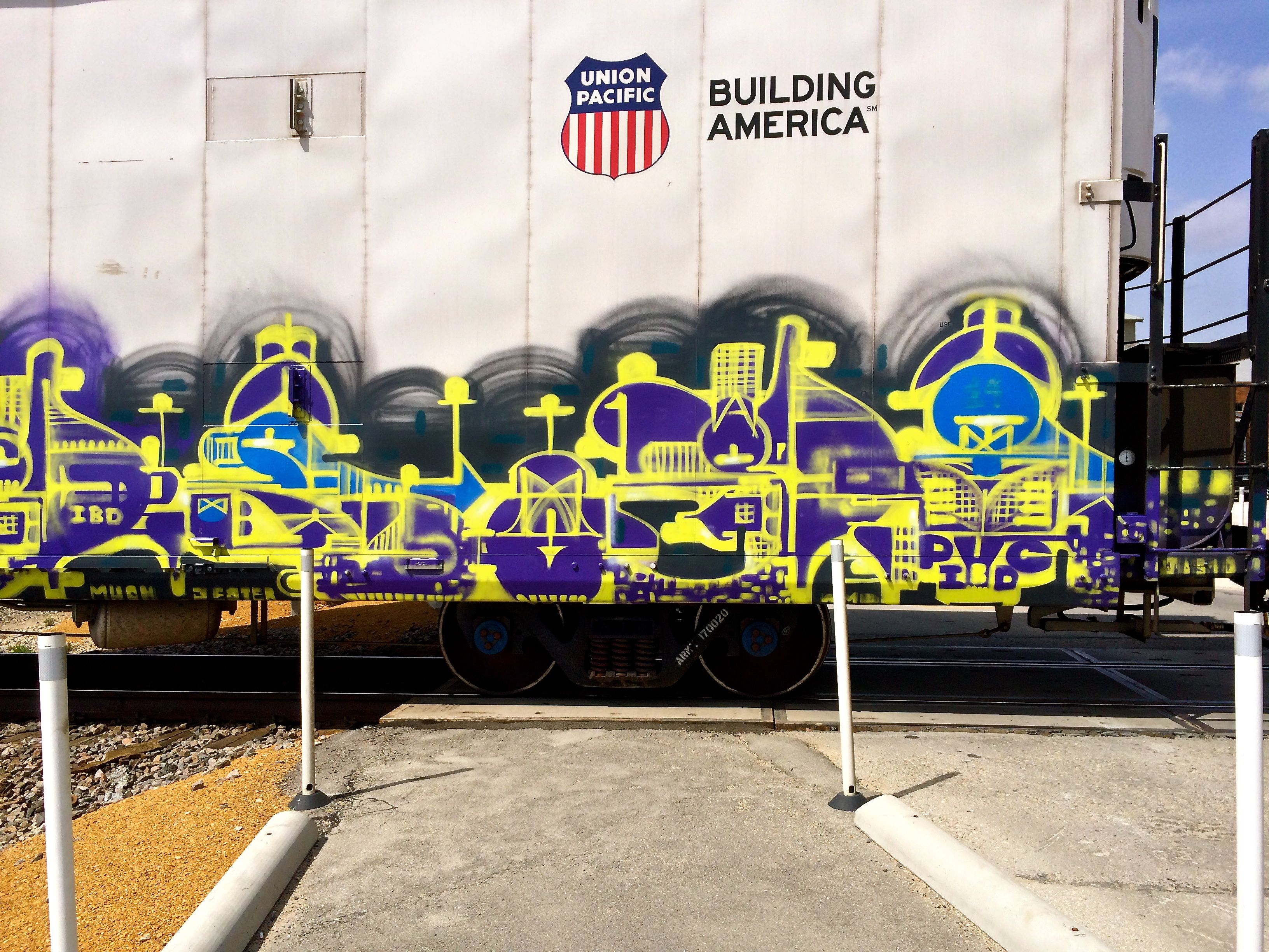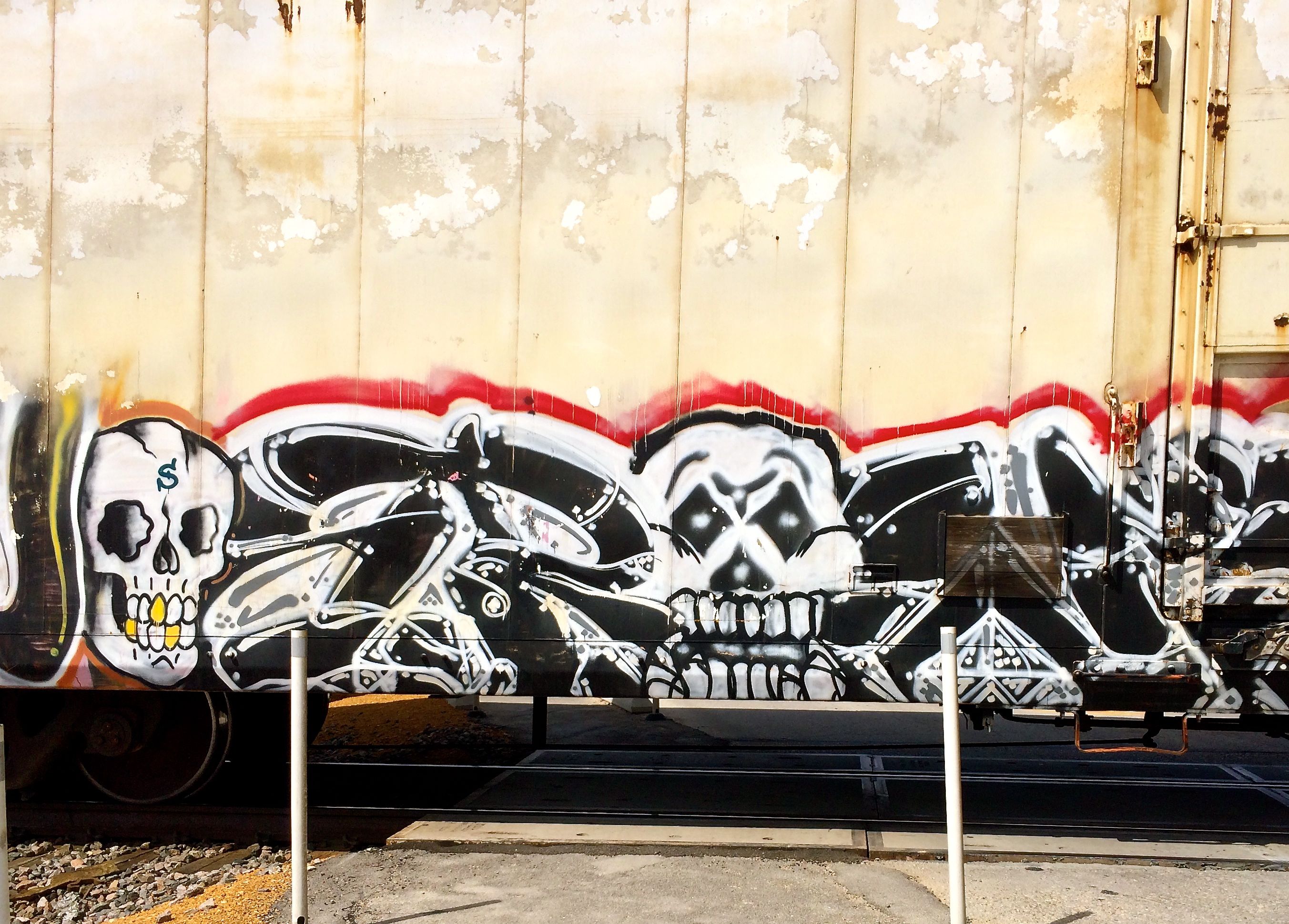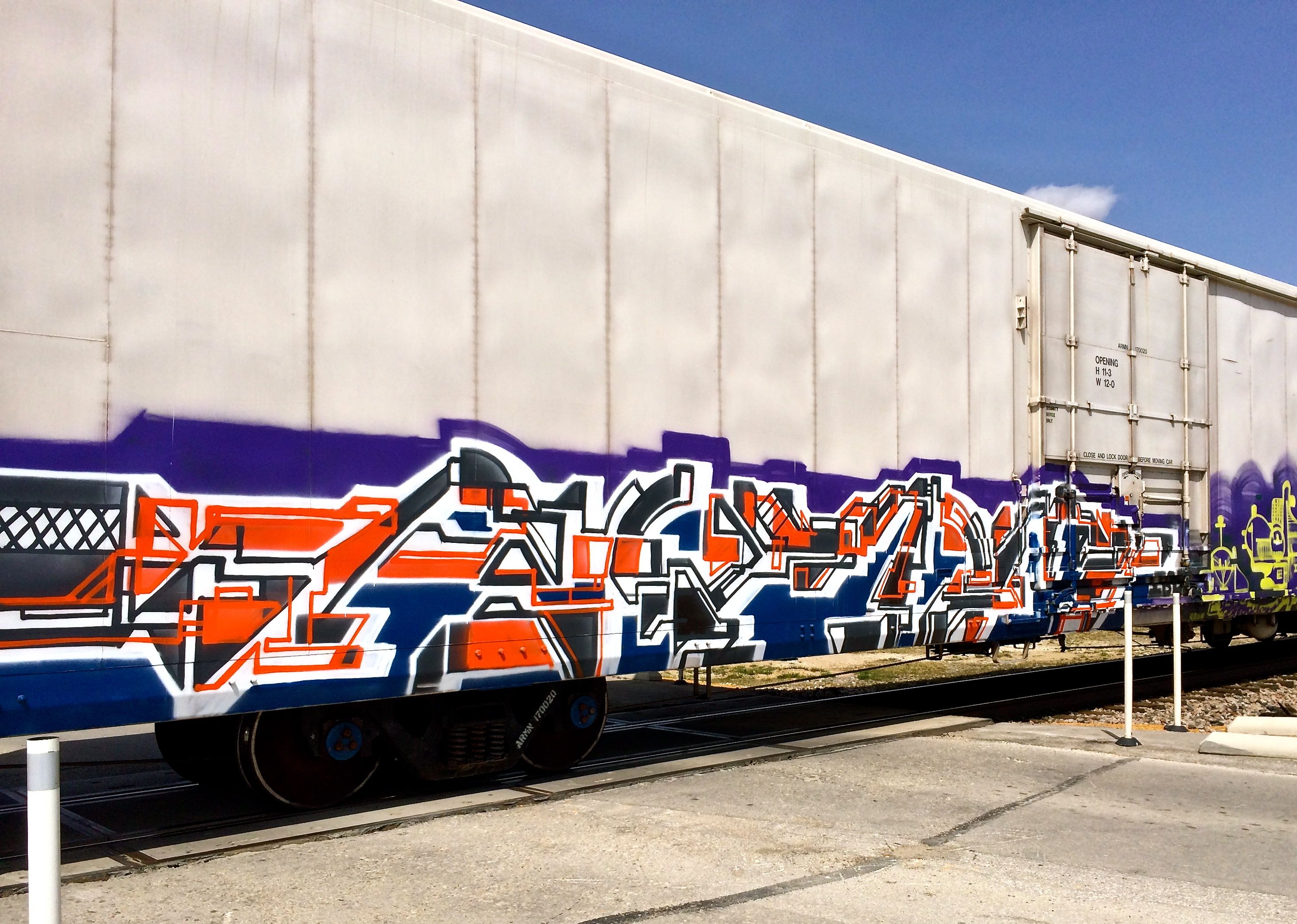 A client and I went to lunch today and our walk to the restaurant was intercepted by a passing freight train….We both enjoyed the momentary artful nourishment of graffiti artist from places unknown….Just think what this artist could do if he wore those drywaller stilts in painting higher than his reach….I would like to think some of these were commissioned. If unauthorized, and this work done mostly in the darkness of night, I’m even more impressed….Every car had graffiti, some showcasing more artistic talent than others. We were wishful for another train on our walk back from lunch (but our timing was not as fortunate as before)….