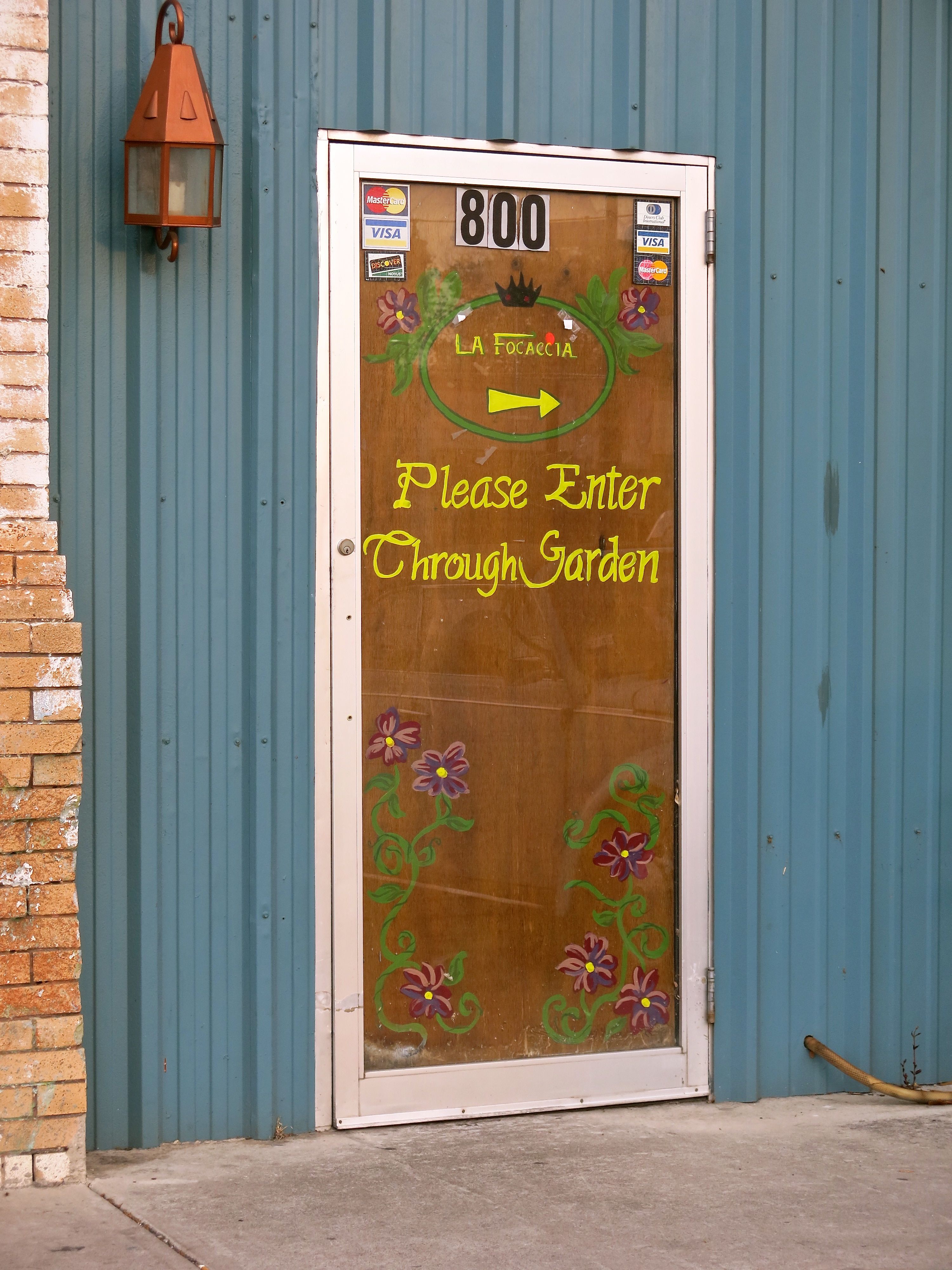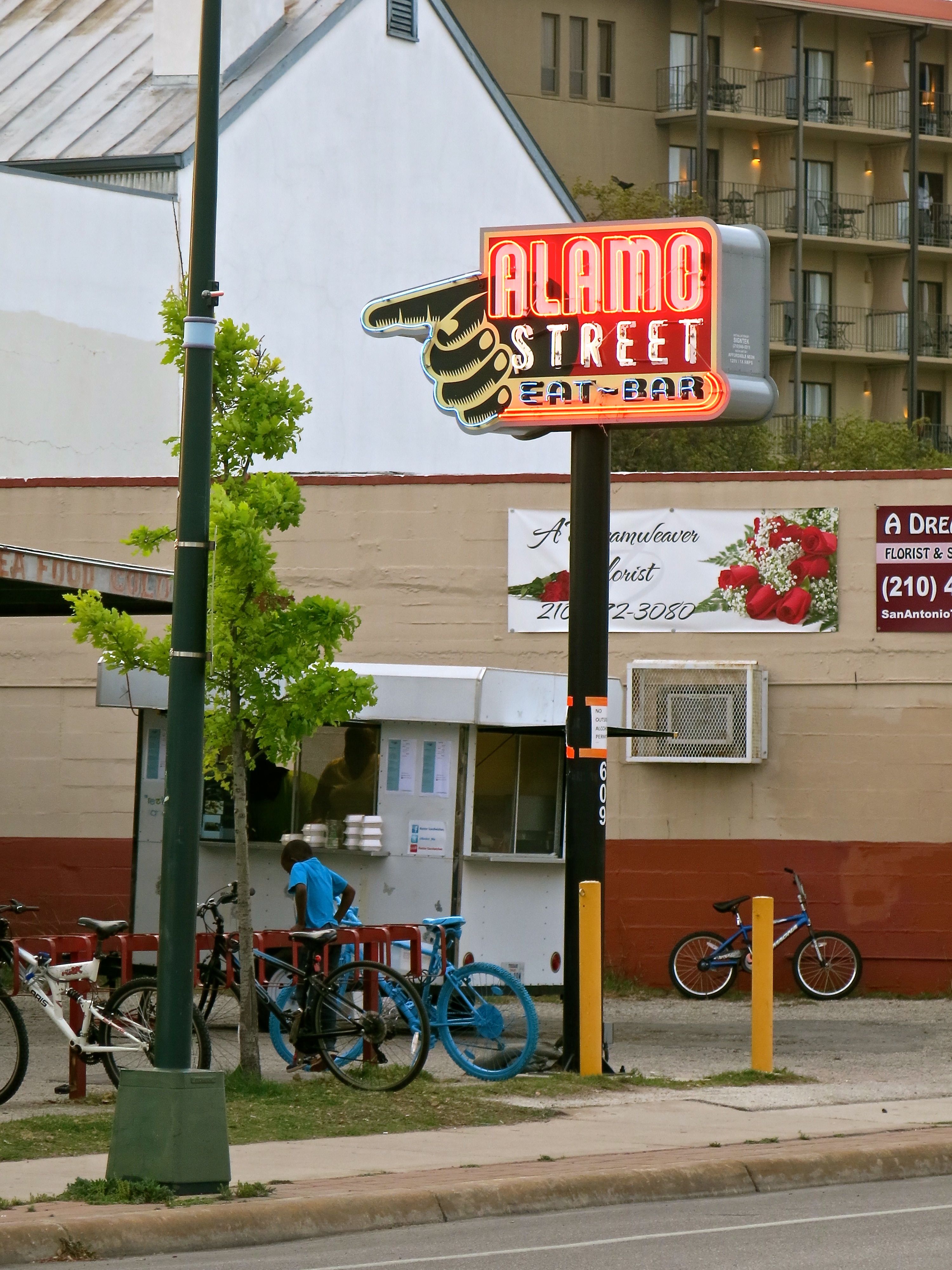 A San Antonio Missions image medallion embedded in the sidewalk…near the RiverwalkWhat is not to like about this sign…Alamo-Eat-Bar?This is just good, sound, calming advice wherever you go….There is something obvious about this sign….Bedlam…Ladies Welcome…beer…and an address of 1-2-3. Let’s go in! (if you can get past the caged gate)