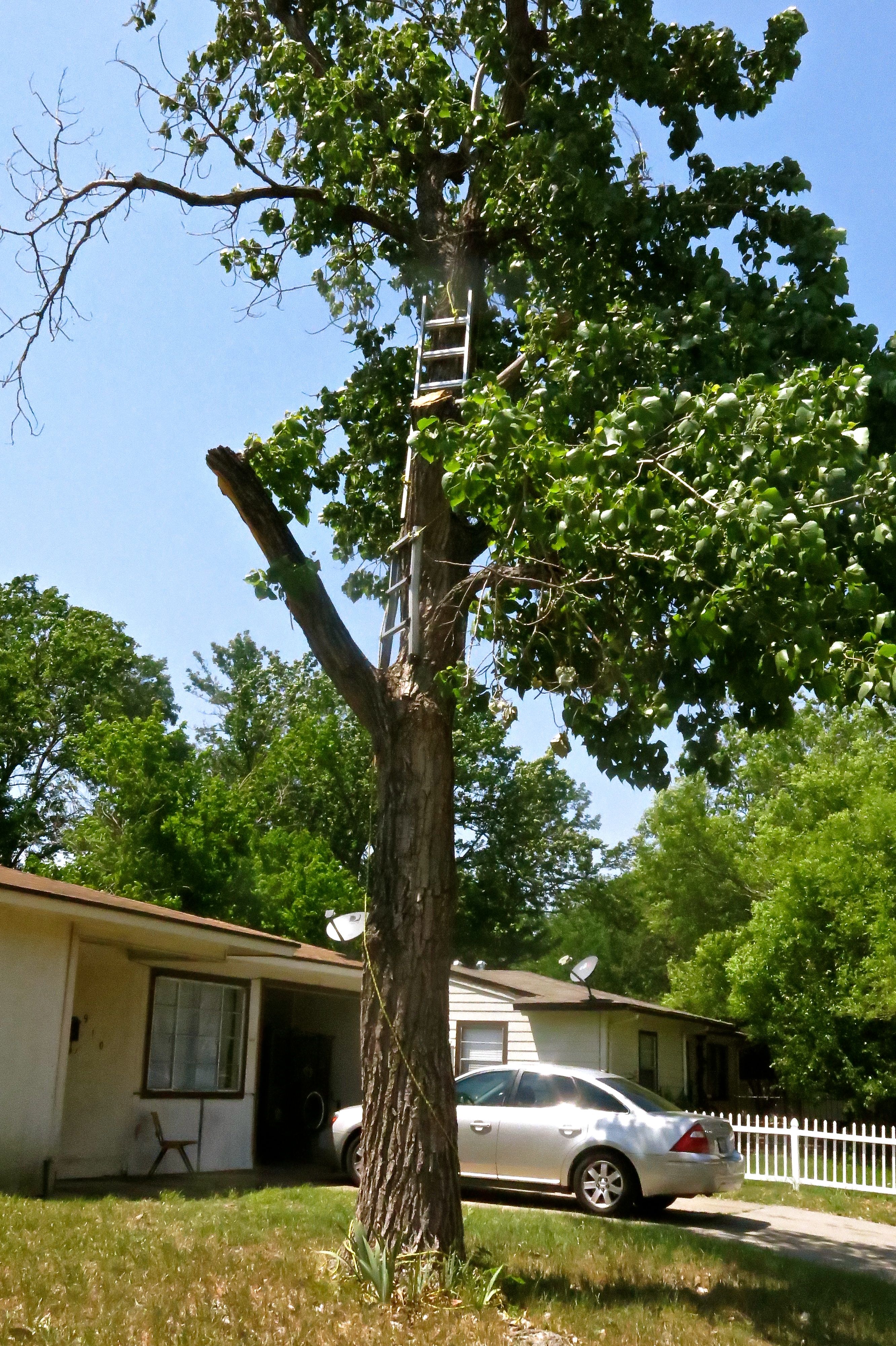 Yes, you are seeing this right. There are ladders strapped to the trunk of the tree so that the homeowner could apparently prune (or should I say ‘carve’) the dead out of this poor Cottonwood tree. At least they took the ground ladder away while taking a break….
