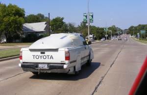 While you’re at it, note the detailed construction techniques: the creative use of duct tape, the ingenious use of wood on the grill, sheet metal and plastic abound, the inverted john-boat to serve as a truck bed cover, and who knows what else. Oh I know, check out the wheel covers….